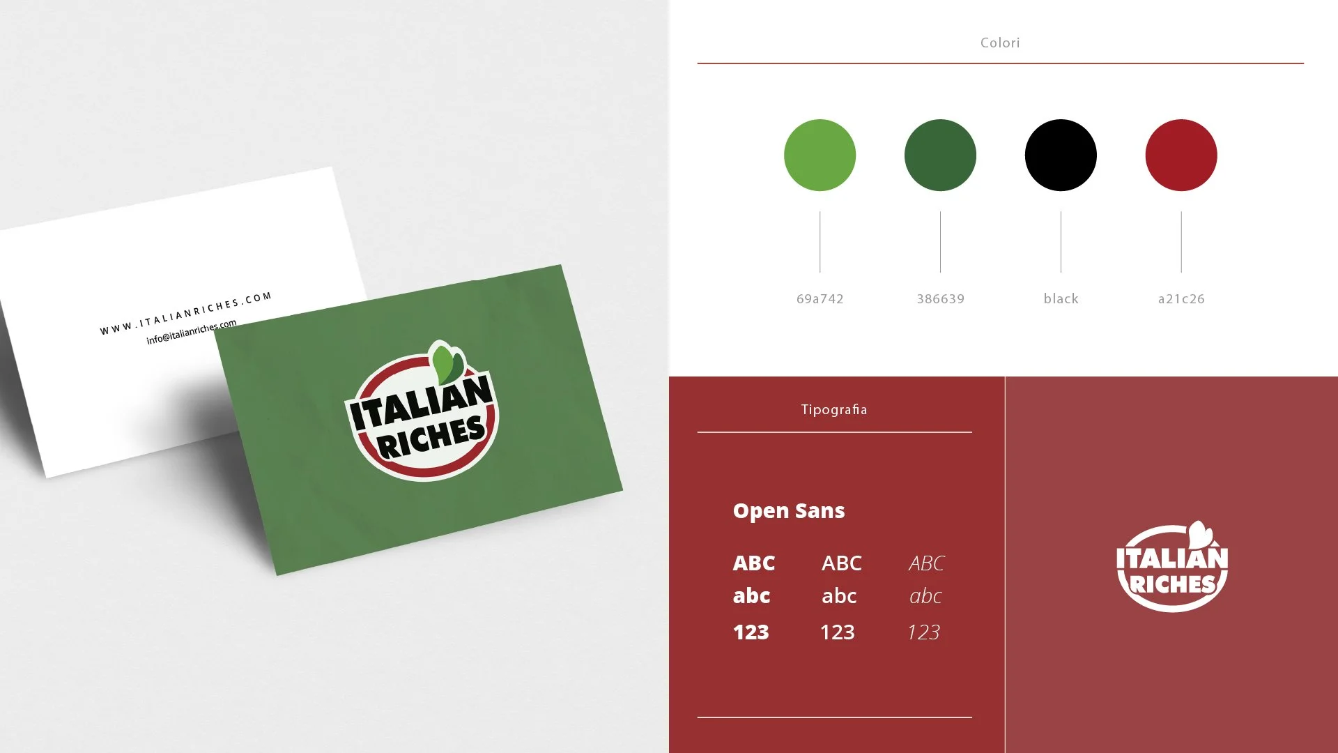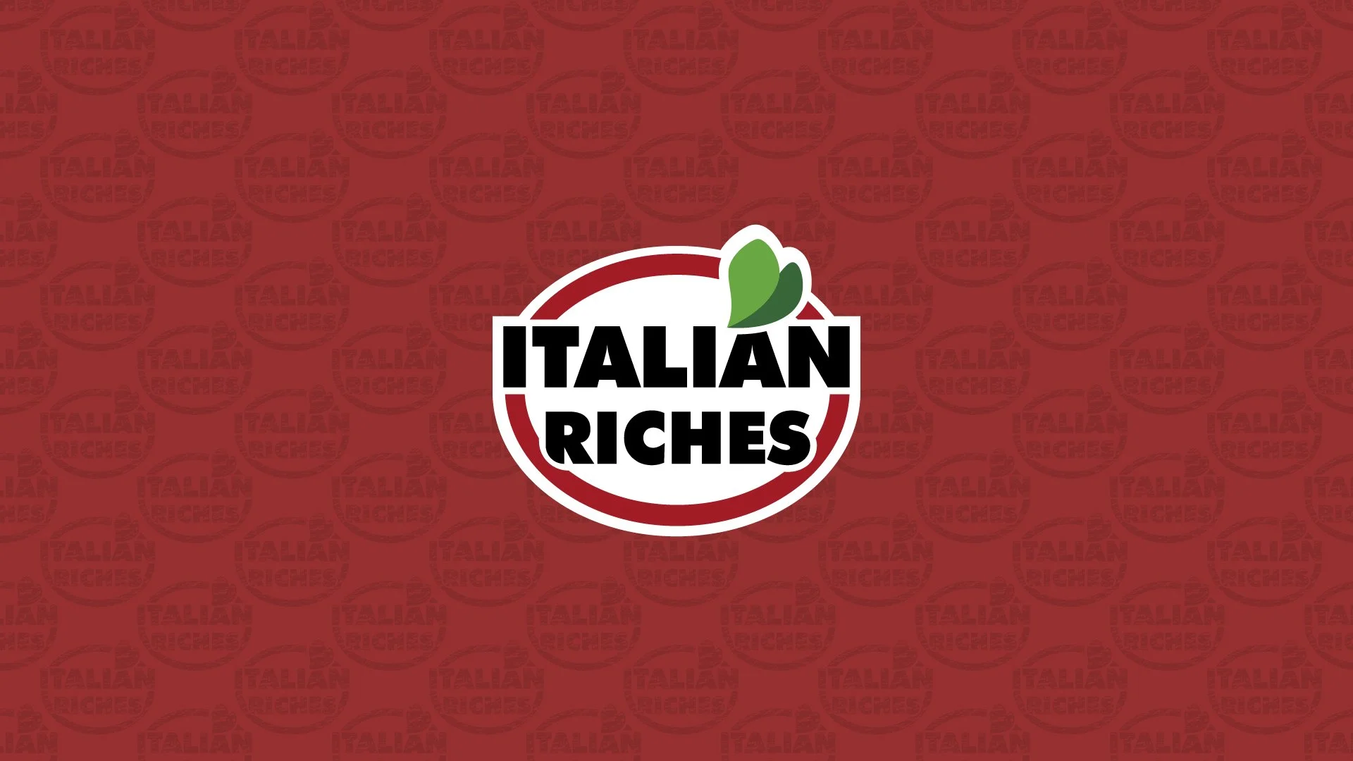 Italia? no: (Big Little) Italy Il brand “Italian Riches” si traduce letteralmente in “Ricchezza Italiana”, va da sé che il marchio vuole trasmettere i valori principali di “Italianità” e “opulenza”: la sfida principale era riuscire a realizzare un logo che potesse trasmettere i due valori principali e tutti i valori secondari (‘tradizione’, ‘semplicità’, ‘grandi sapori’) ad un pubblico non italiano e che dunque può essere abituato ad operare un’identificazione differente di certi valori. Essendo il brand in lingua inglese, il punto di riferimento per la realizzazione del logo è stato il paradigma culturale anglofono, o per meglio dire, il paradigma italo-americano. Come colori tematici principali sono stati scelti il rosso, il bianco e il verde, come elemento grafico iconico ho proposto una stilizzazione di due foglioline di basilico, la cui associazione all’italianità, alla freschezza e alla genuinità è pressoché immediata; Il logo graficamente si presenta come un ovale rosso su campo bianco, interrotto dall’icona del basilico e con il brand name “Italian Riches” scritto in Open Sans maiuscolo nero con bordo bianco che campeggia in sovrapposizione.